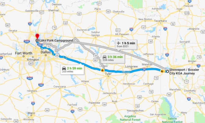 Traveling west and out of the predicted severe weather area that the National Weather service had published seemed the better part of valor. Call us coward if you will but we’ve been a few hours away from some towns devastated by tornadoes, which is too close for us. We picked up, packed up and jacks up and were out the door, so to speak, on our way to the Dallas, TX area before 8am on Wednesday. Interstate 20 will take us to the Dallas area then a series of jukes up to Lewisville where we’ll spend a couple of nights at the Lake Park Campground, just a part of the City of Lewisville’s huge Parks and Recreation complex located on the shore of Lewis Lake.
