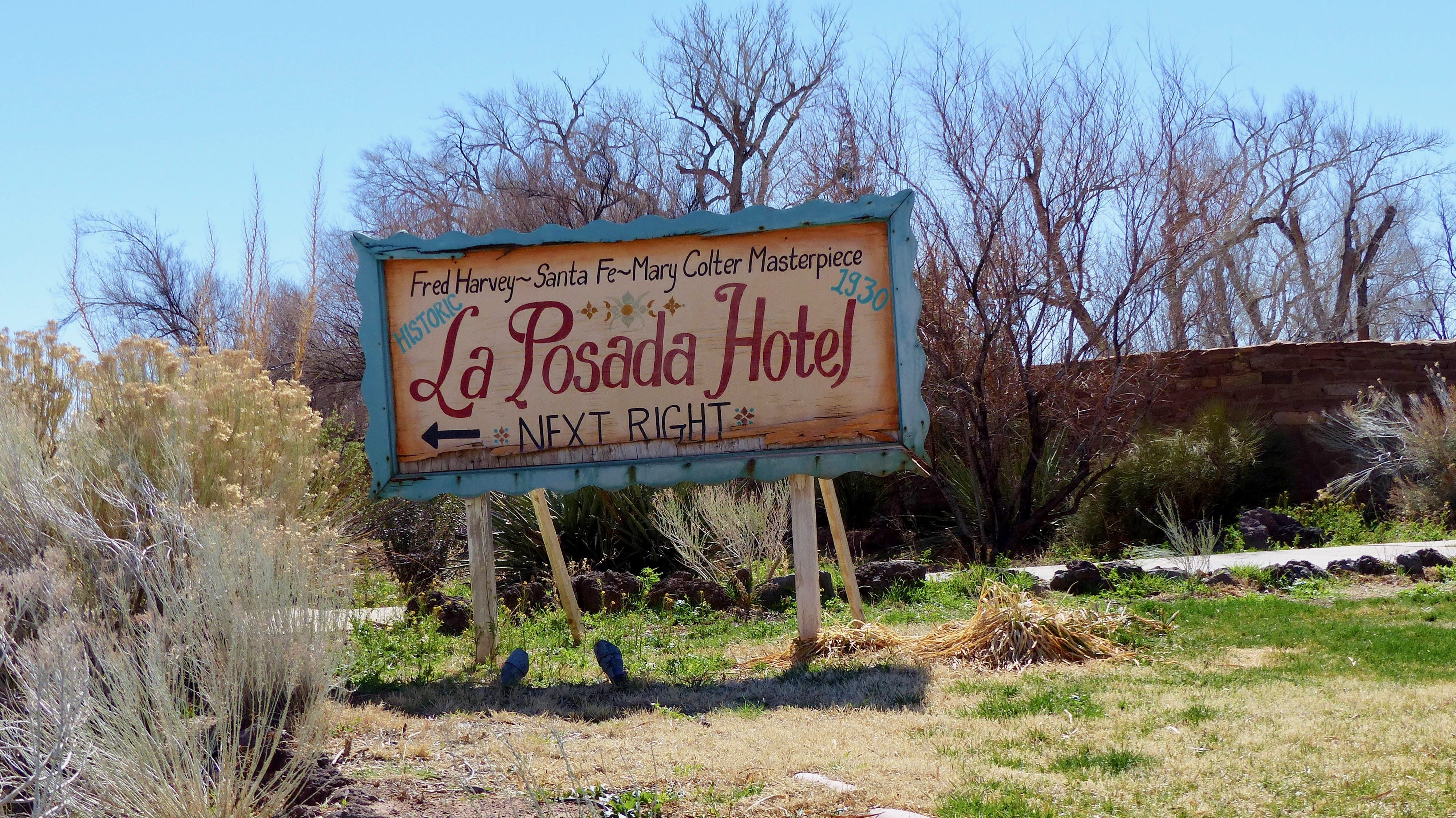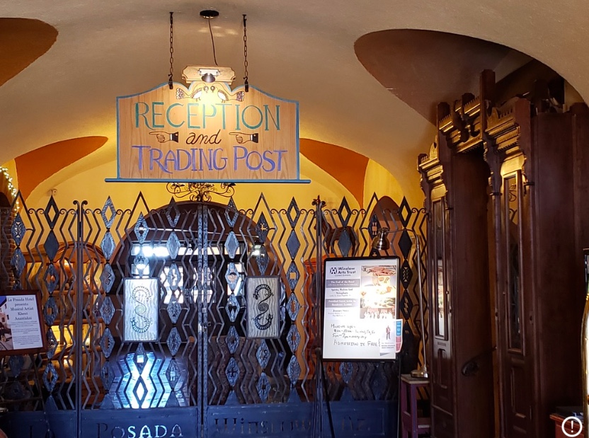 There’s lots of eye candy in Winslow. Signs, benches, window displays all tout the Route 66 and Standin’ On The Corner icons. But we also walk a short ways from downtown to visit the historical La Pasada hotel.
