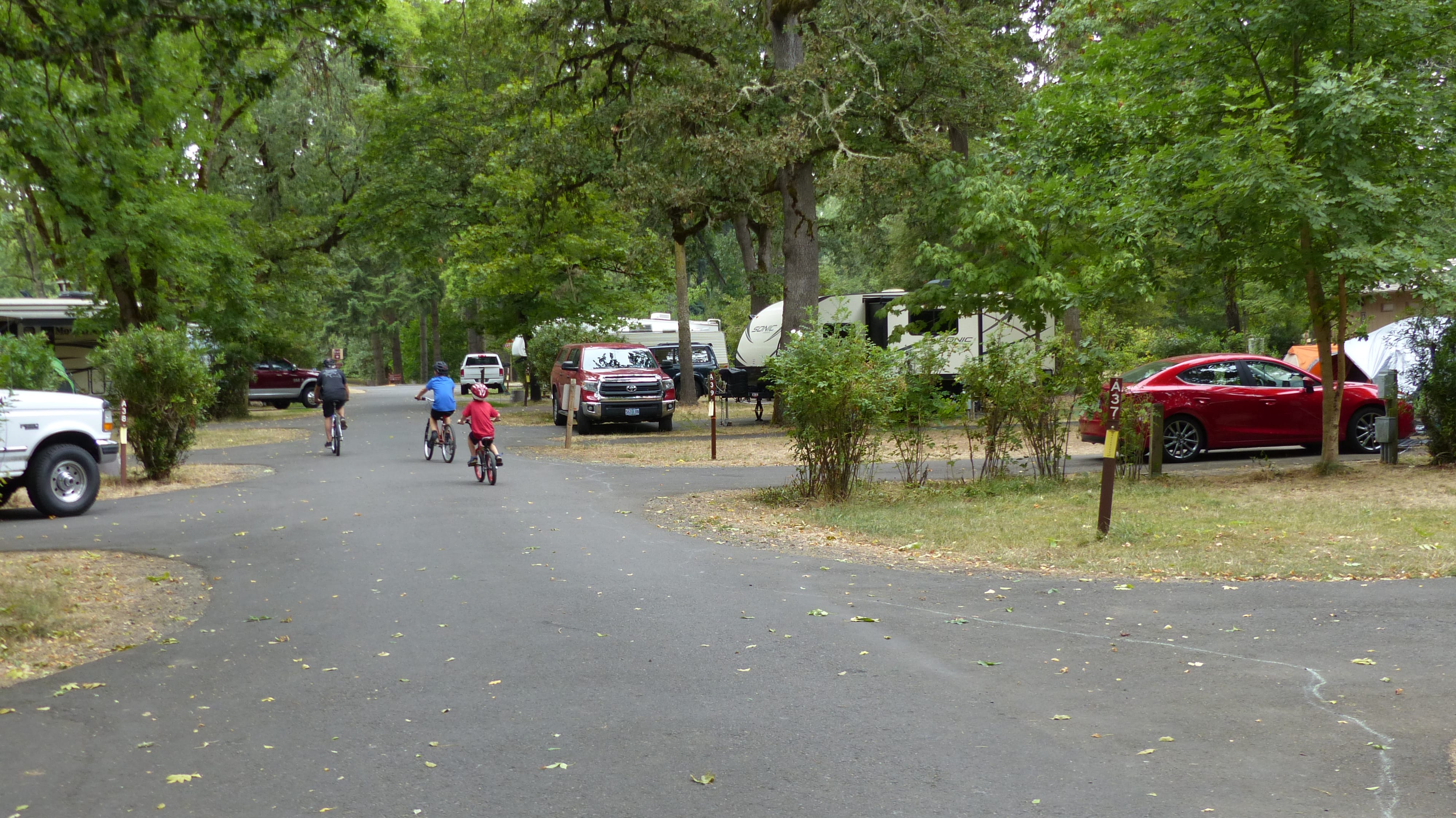 Ten miles more and we pull into Champoeg State Heritage Area. The heritage area has several historic buildings, the Historic Butteville Store (1863) that is still open for business, wide open fields, forests and wetlands- all on the bank of the mighty Willamette River. Interdispersed with all of that is a huge picnic area, frisbee golf course and a nice campground.