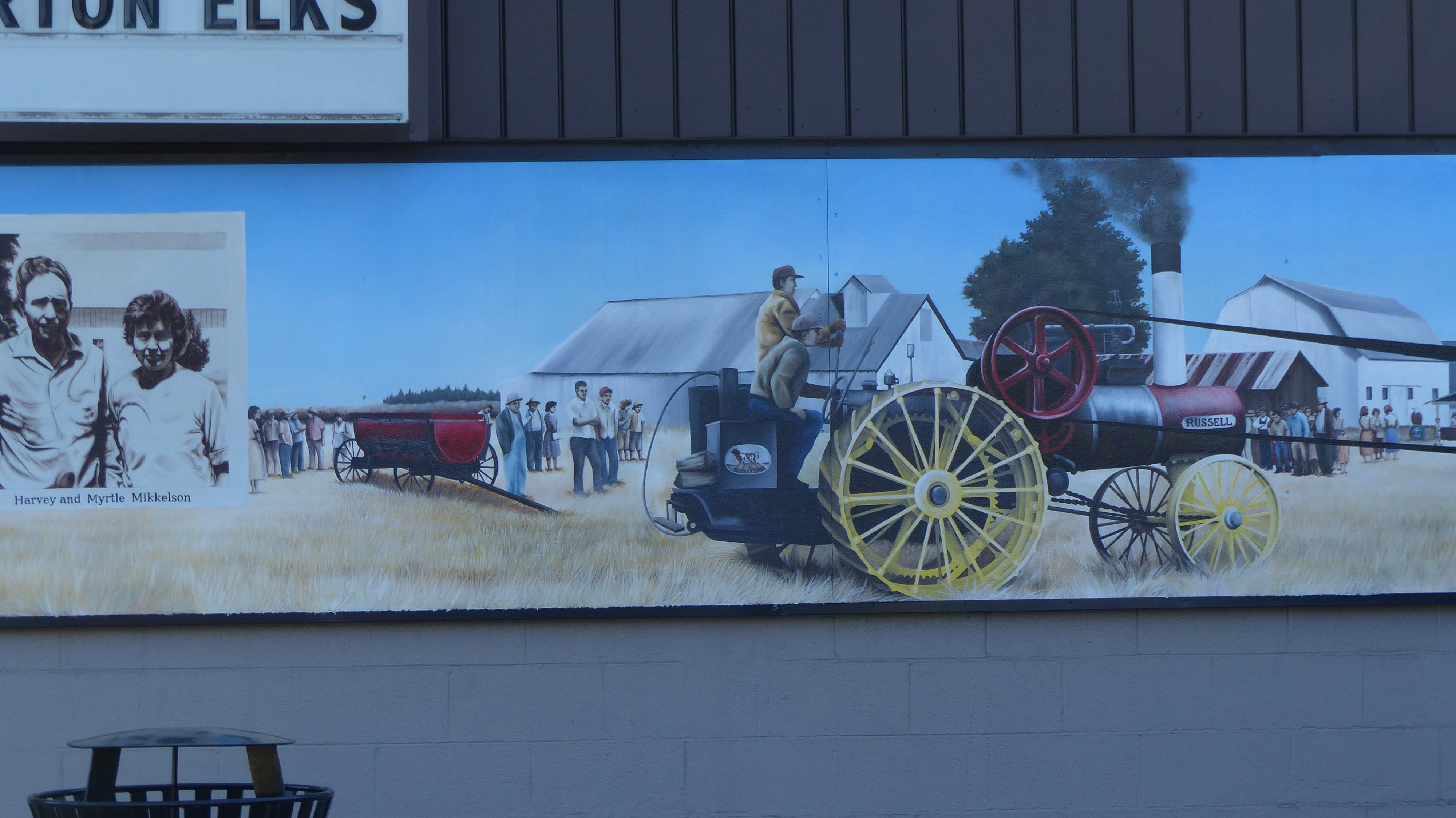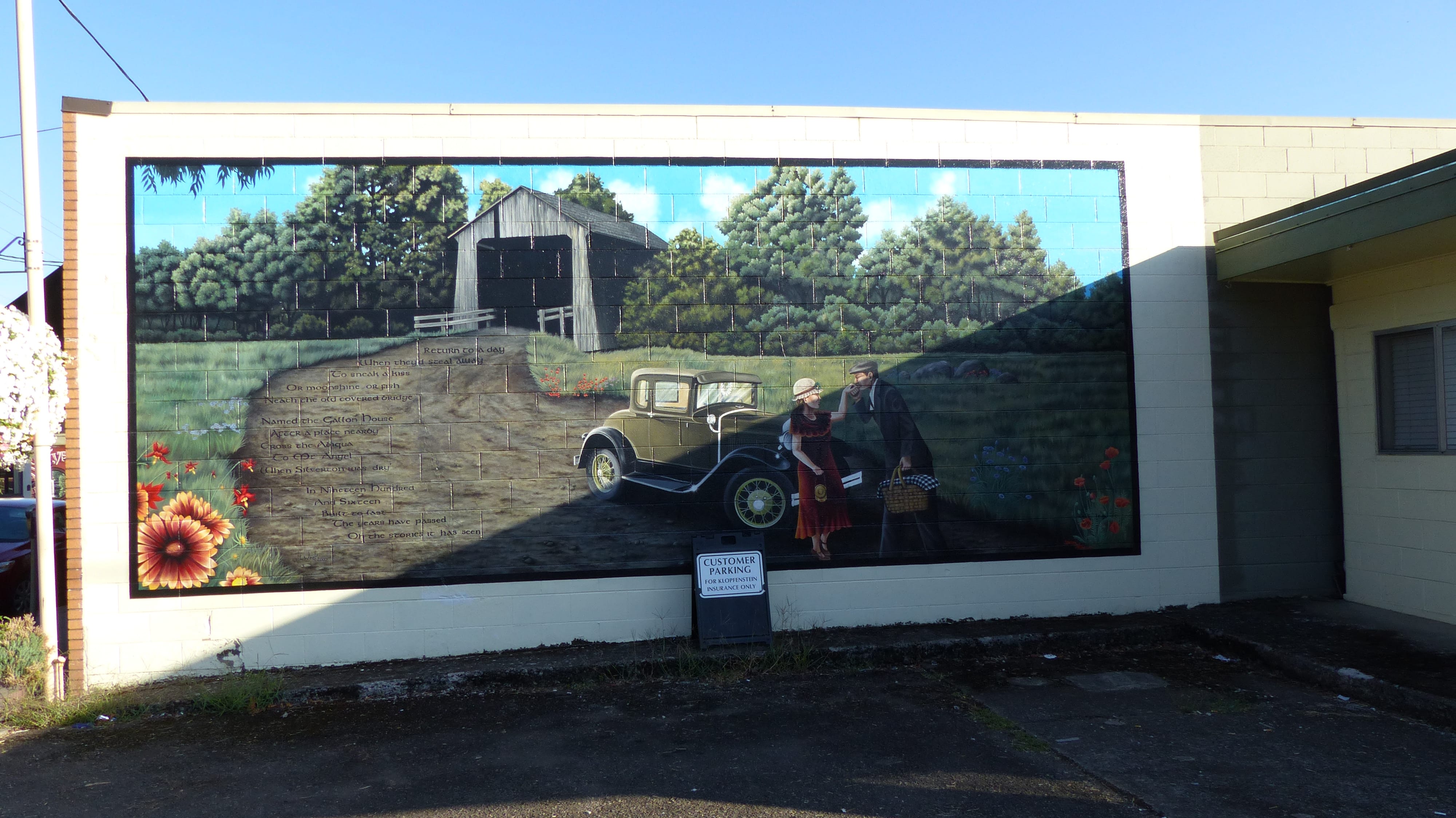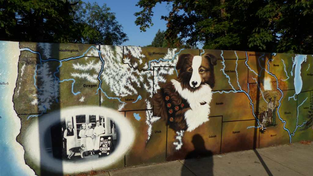 One multi part mural told the story of Bobbie the Wonderdog. He became lost (attacked by 3 dogs and fled) while his owners, the Braziers visited family in Indiana. The family could not find him so it returned to Silverton. Six months later Bobbie returned to Silverton mangy, dirty, scrawny, with evidence he walked all the way home, a distance of over 2500 miles in the dead of winter. After his story was published folks who had fed and sheltered Bobbie wrote to the family about their time with him. The Humane Society of Portland was able use the stories to assemble a fairly precise route that Bobbie traveled.