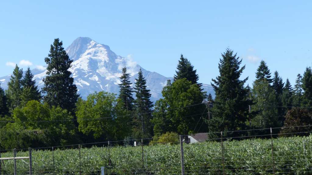 The valley is spectacular. Farms and vineyards have been carved out of the forest creating a patchwork of multi hued green. Pear, cherry and apple tree orchards as well as grape vineyards abound. In other areas not suitable for those crops alfalfa and hay are grown. Farm stands dot the road. As we look back we see Mt. Hood standing sentry over us. It doesn’t get any more beautiful than this!