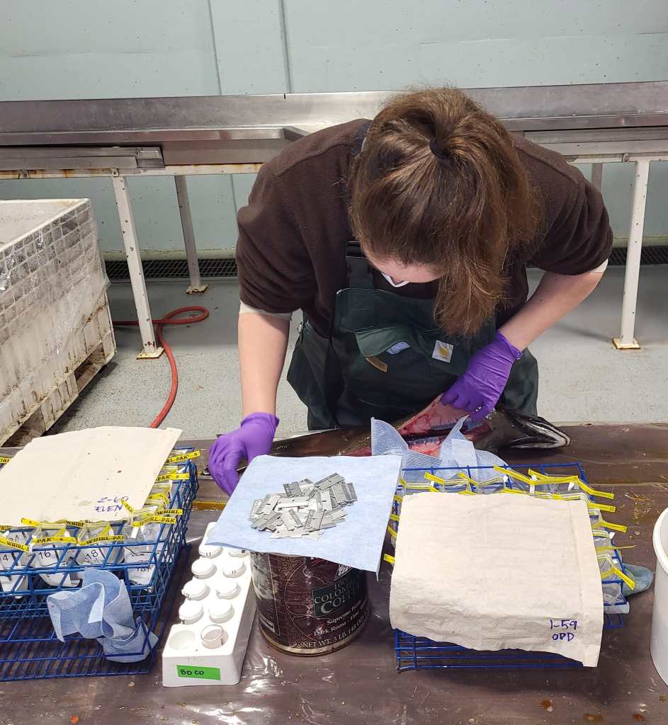 Spawning coho salmon/ biologist taking tissue samples from coho
