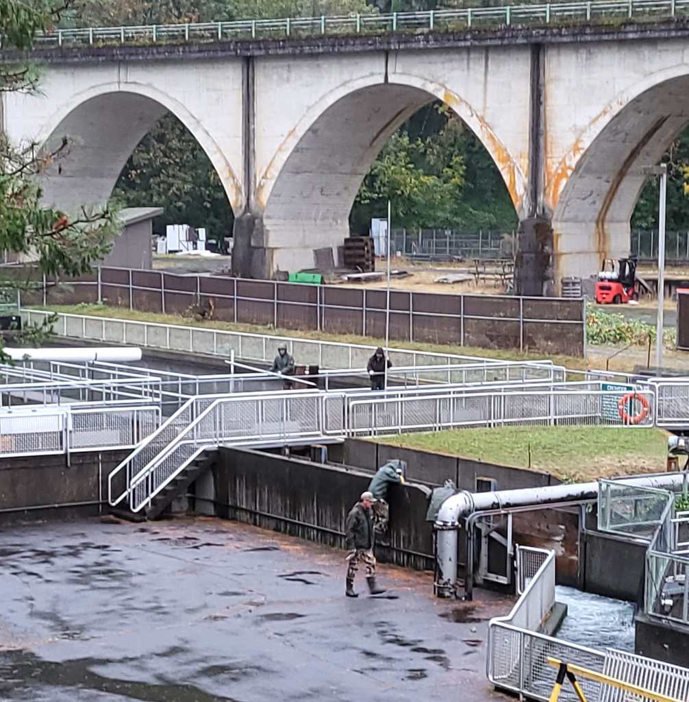 The coho salmon that were put in the spawning polls several weeks ago are finally “ripe”, meaning the female’s eggs are ready and will easily release from the egg sac in their body. The first eggs are going to cascade hatchery. Cascade has brought their own egg buckets and transportation. Those eggs are mostly destined for indigenous peoples hatcheries once the fish hatch into fry. I guess those folks don’t have a lot of success or patience to raise eggs to the hatch stage. Jil again was asked to assist with spawning so she and Deanne manned (ladied?) the buckets of eggs combining eggs and milt, mixing, placing lids of the buckets of eggs and taking them to the waiting pickup truck for transport back to Cascade Hatchery.