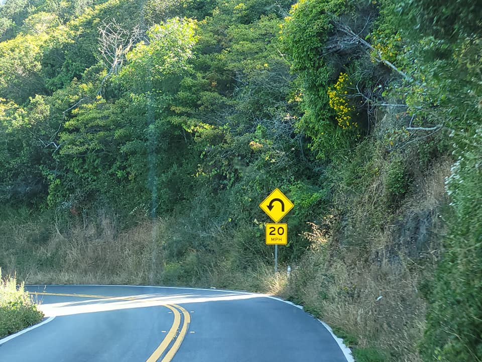 This place became a boomtown due to the tanbark industry.The town is very clean and looks to be in good health in spite of the economic downturn. We continue west on Cal 20 which transitions from the flats quickly into more mountainous driving. I should say really mountain driving as the road twists and turns with 25 mph curves in abundance on a relatively narrow roadway with zero for a shoulder. One fella who owned a home along the route even had a sign out saying “No turn out- Ditch!” on the side of his driveway to warn drivers of large vehicles not to use his driveway as a slow vehicle turn out.