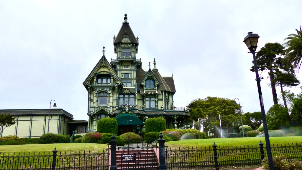 Continuing on we pass through many towns. Eureka (27000 souls) is at the heart of the redwood coast and seat of Humboldt County.It’s the largest city between San Francisco and Portland Oregon. Humboldt Bay, second largest bay in California, was overlooked by explorers (they couldn’t find the entrance) until 1849 when an overland exploration provided its exact location. The town was established in 1850 as an alternative to the long overland route from Sacramento to supply gold miners on the Trinity, Klamath and Salmon Rivers. Then came the logging industry along with its lumber mills. In town is the majestic Carson Mansion, constructed for lumber magnet William Carson: https://www.ingomar.org/carson-mansion/mansion-history
