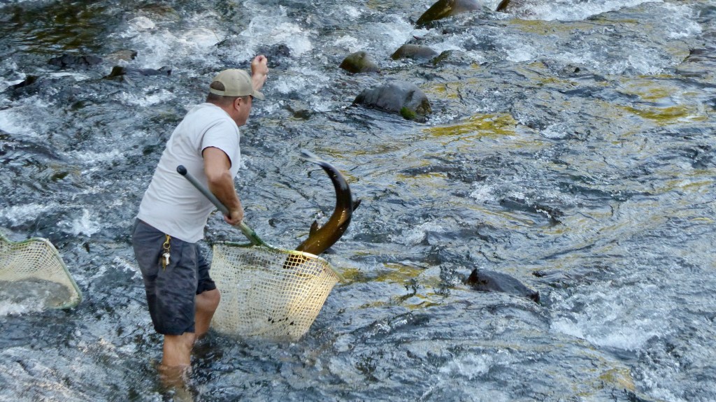 We had some excitement recently- a Salmon Rodeo! Yep, you read that right. The hatchery has been short handed with one member out with an injury and another loaned to Cascade Hatchery. Normally the water channels, the fish ladder and the holding ponds would all be ready to receive returning fall run salmon but not this time. Several hundred salmon returned to Tanner Creek only to find the fish ladder dry as a bone so they jumped over the weir and swam upstream a ways. So it was all hands on deck to ready the hatchery for their arrival which included borrowing some folks from Cascade Hatchery. The “rodeo” began in the morning. The fish folks went up Tanner Creek to the hatchery property line with nets and pushed the fish back down past the weir. A couple of “pushes” and most of the salmon had been pushed downstream from the weir at which time the electric fence was energized prohibiting the salmon from swimming upstream again. Today salmon are swimming up the fish ladder and congregating in the lower pool as designed.