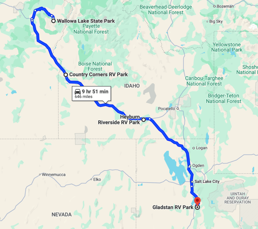 Our stop for October 4th is the Country Corners RV Park located just outside of Caldwell, Idaho (66,000 souls) in an area they call Sand Hollow. The park is nice, sites not too close to one another with grass in between sites and lots of grass and trees on the west side reminiscent of a park. The park is far enough off of the interstate to be pretty quiet. There are tomatoes and cucumbers in a box outside which are grown by the lady in charge. She offers them for free. We like this park.