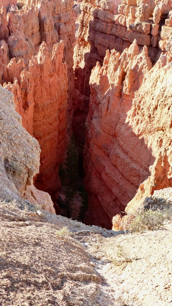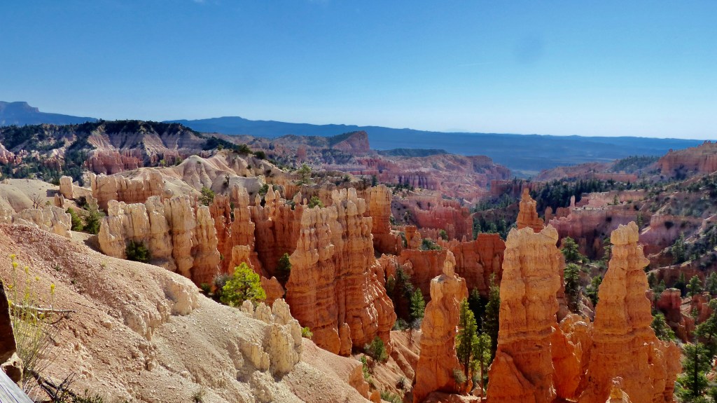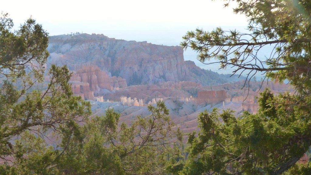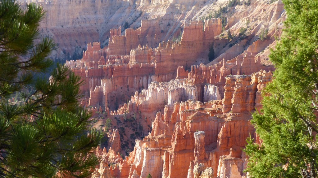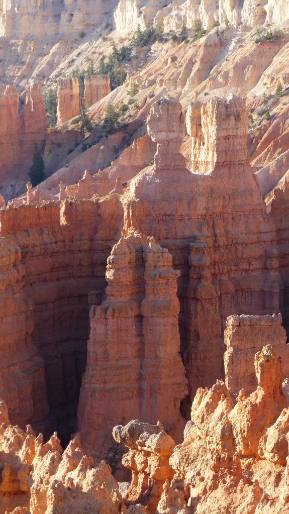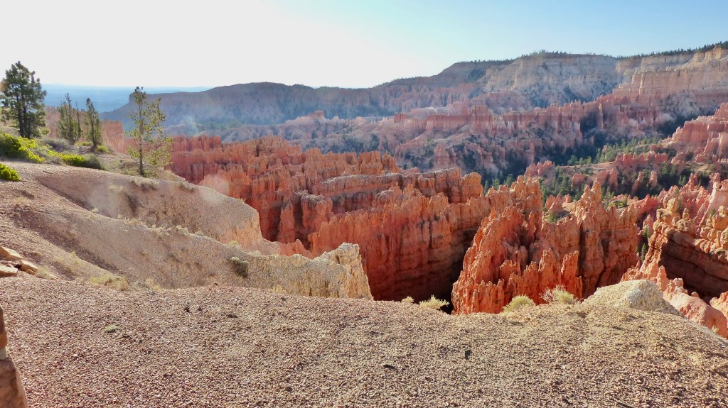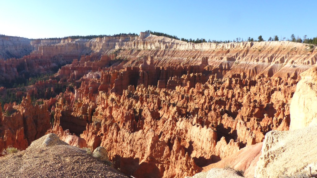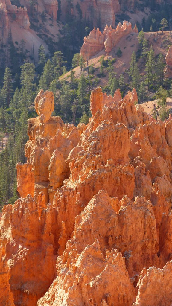 We decided that we would see more the next day and let the thundering herd subside somewhat if that’s possible. So the next day we head up the road a ways farther in the hopes that Sunrise and Sunset Points are much busier due to their nearness to the entrance. Hey, we were right. Bryce Point, in our opinion is the premiere location to view Bryce Canyon. The view is a panorama of cliffs, hoodoos, spires, closely stacked ridges their reds contrasting with the green conifor forest at their feet. So beautiful.