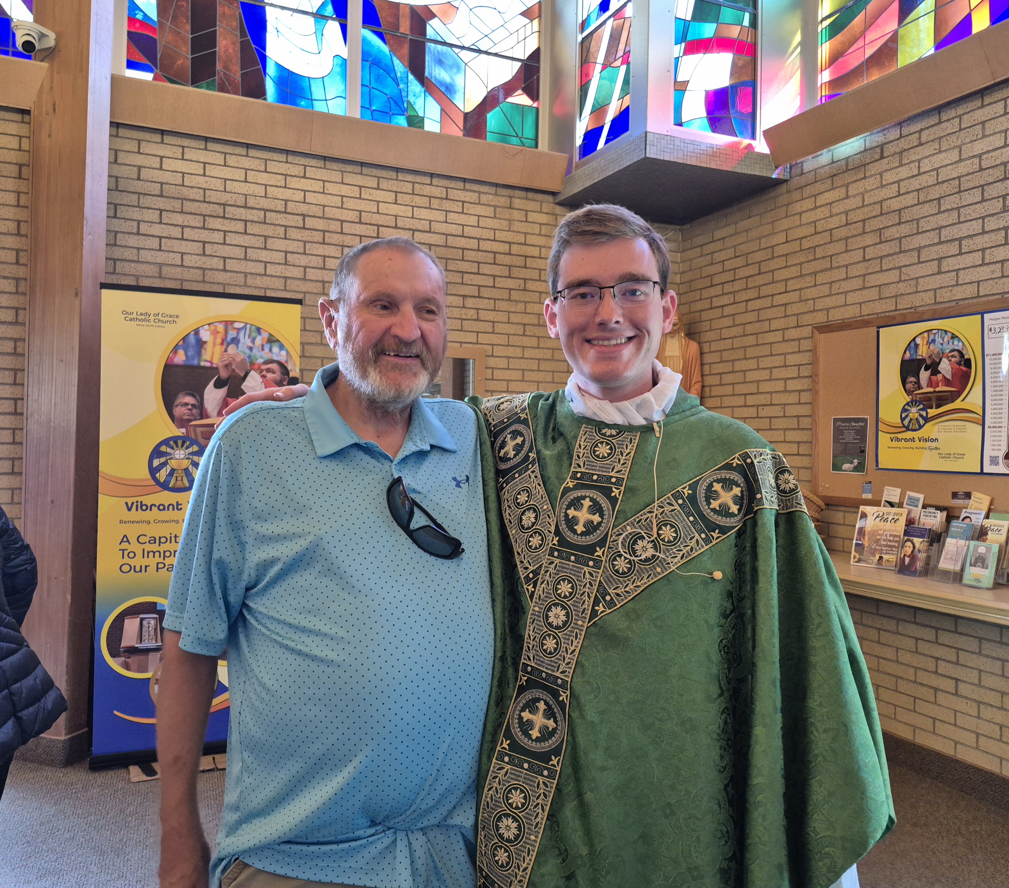 Sunday we met Deacon Bob Dangel, his daugther and two grand boys at Our Lady of Grace Catholic Church. We enjoyed Mass and the priest’s homily. Bob has been aged out as a Deacon. He introduces us to the young priest, and out of respect for Bob the priest addresses him as Deacon.