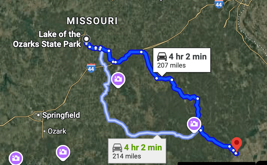 We head out on nice four lane US 65 for quite a few miles. If we stayed on this highway we’d wind up in Springfield MO; the lake is quite a bit north of Springfield so we’ll be getting off US 65 in favor of other highways. That turns out to be our downfall. Jil’s phone is not set up for big rigs so it will take us willy nilly all over the countryside at its every whim.