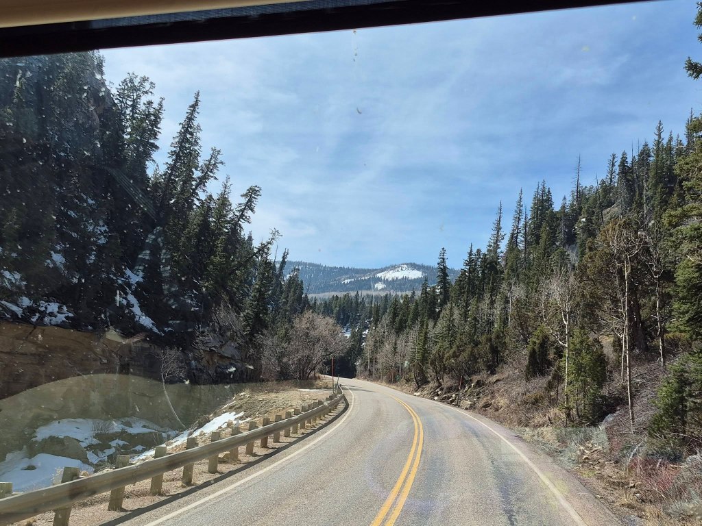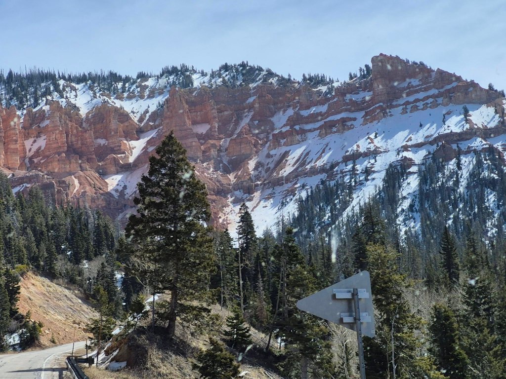 Part way up the canyon it narrows considerably and the road gets very windy as it claws its way past huge cliffs. This doesn’t last long as we wind higher and higher up the mountain. We get up past the snow line but no snow on the road. It’s very pretty.