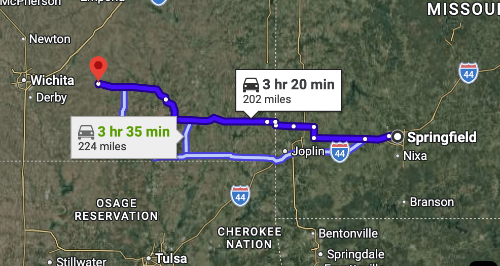 Springfield (169, 176 souls) is by known several nicknames- the Queen of the Ozarks, , the birthplace of Route 66 and the Buckle of the Bible Belt. It’s also home to Bass Pro Shops and O’Reilly Auto Parts. An airport large enough for jet planes is in town. I assume most passengers would be going to Branson MO which is less than 44 miles away.