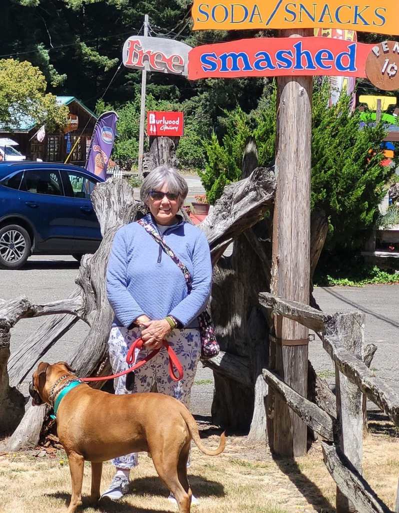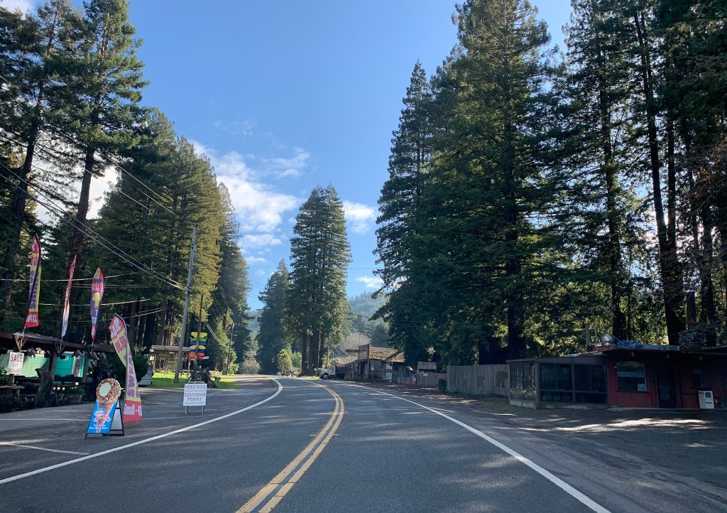 We drop off of US101 and stop in the tiny community of Redcrest (110 souls) to stretch our legs. As with most of the small communities along the Redwood Highway its economy is tourist driven. Jil treats us to an ice cream cone, the mutzos are treated to a good petting by a local gal, and we are on our way. We choose to stay on the old Redwood Highway for a while, enjoying the deep shade provided by the big redwoods.
