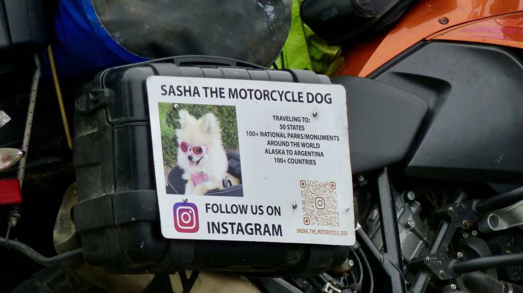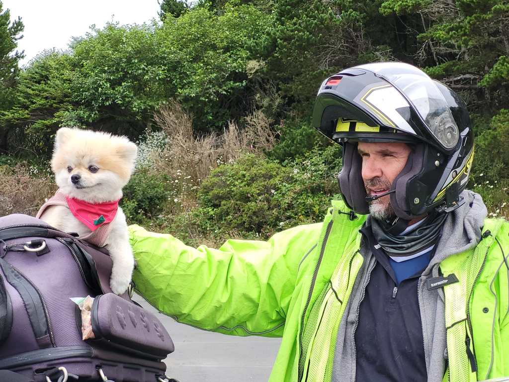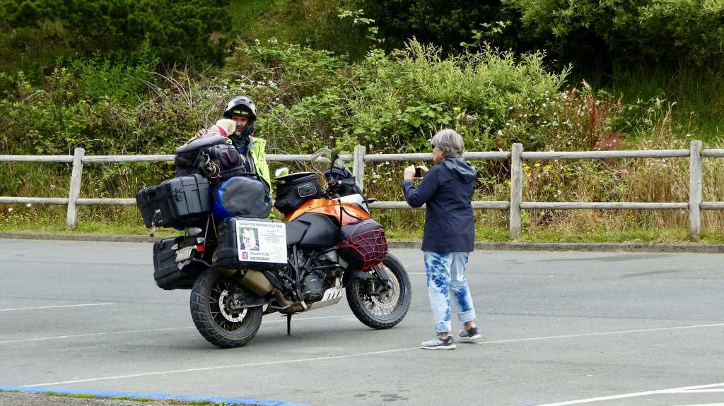 We visited downtown Brookings, cruising the main drag. We shopped at the huge Fred Meyers store, bought groceries, then went sight seeing. We are impressed with the beautiful and functional Azalea Park. We then head to Harris Beach whose beautiful campground has a perpetual “no vacancy” sign, but one can drive down to the picturesque beach. Jil spots a little dog sitting on top of a motorcycle, gets curious and starts a conversation with the rider. He’s traveled to 25 states with little Sasha riding shotgun, camping with gear he carries on his motorcycle. He lives in Arizona, traveling in the summer months when it’s too hot to stay home.