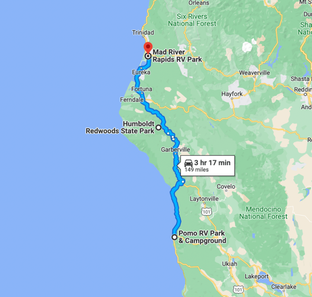 The last 100 miles takes about the same amount of time as did the first 40 even with a half hour layover in Redcrest. US 101 is a much better road than the last 40 of CA1. We pass by Fortuna, then through Eureka on our way to Mad River Rapids RV Park located 8 miles north in Arcata.