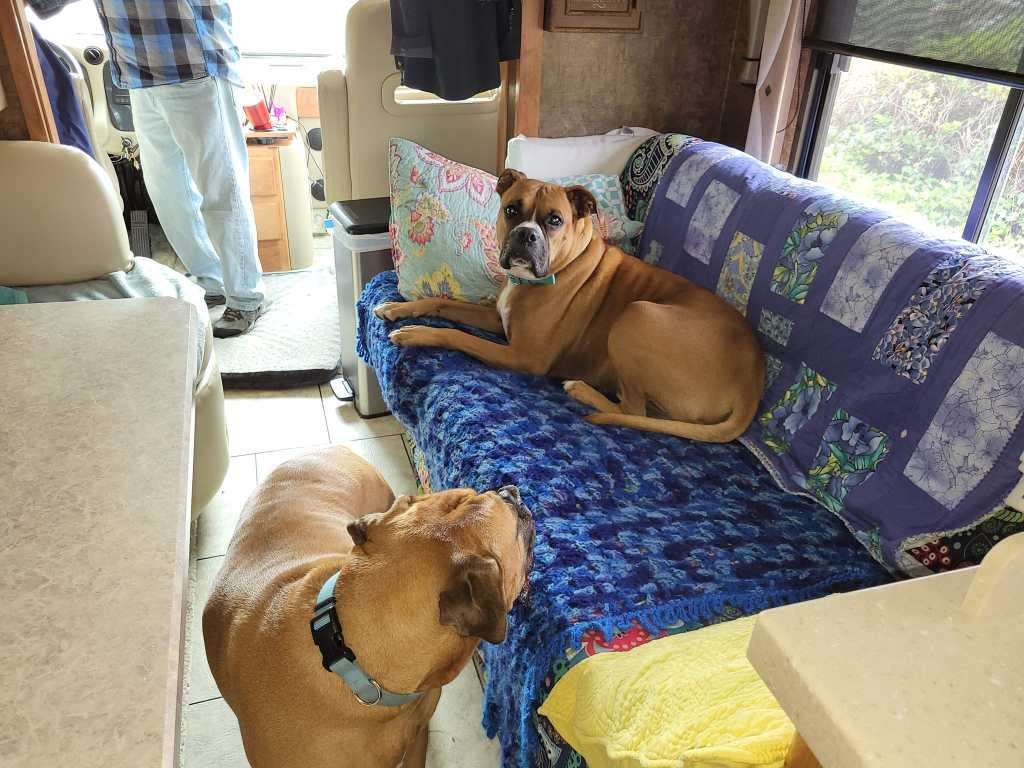 Constantly having to step over two large dogs lying on the very limited floor space of the travel trailer lead to a costly but welcome upgrade- a new truck to tow a new, more comfortable double slide 5th wheel. We wore that combination out and purchased our second 5th wheel, a triple slide Heartland Big Country 3250TS, then a new truck to pull it up to Alaska and back. Three slides and we still step over the dogs! Oh well.
